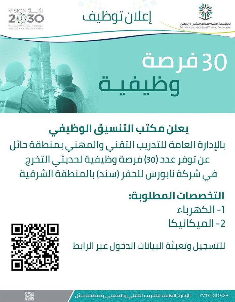 التدريب التقني بمنطقة حائل مُمثلاً بمكتب التنسيق الوظيفي أعلن عن توفر عدد (30) فرصة وظيفية لحديثي التخرج في تخصصات الكهرباء والميكانيكا بالتعاون مع شركة أرامكو السعودية نابورس للحفر (سند)، وذلك وفقاً للتفاصيل وطريقة التقديم الموضحة أدناه.