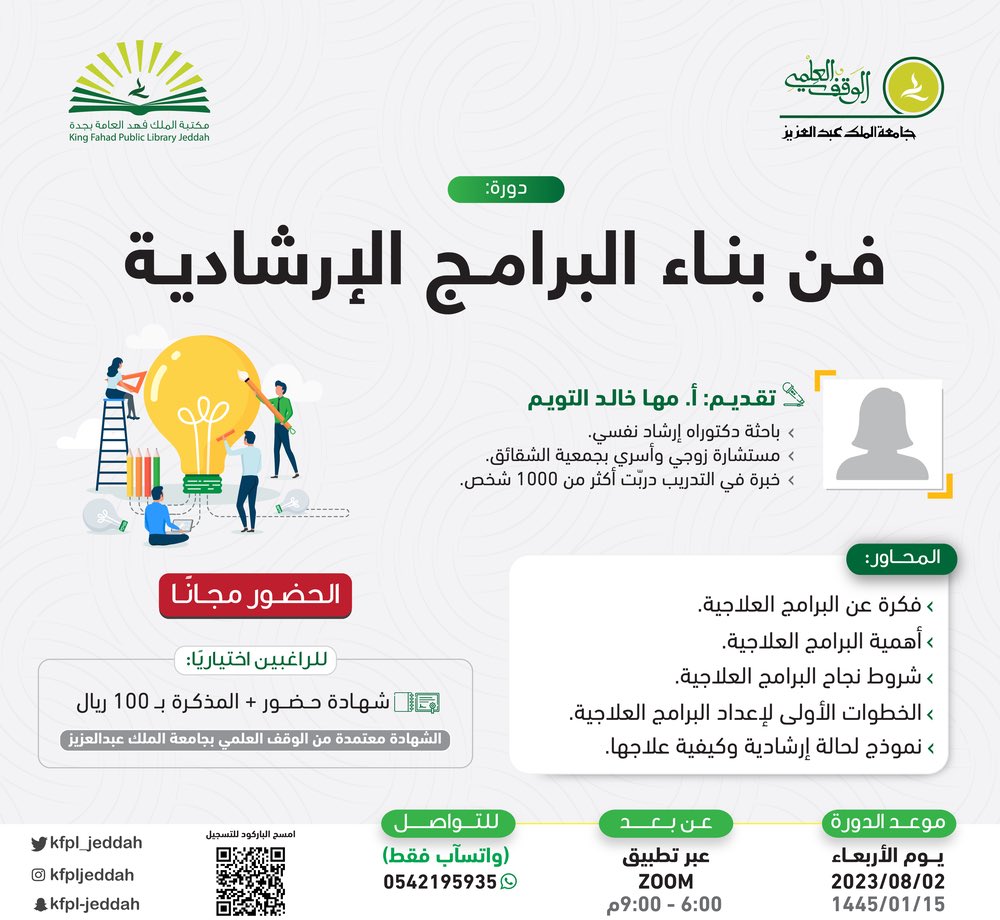 مكتبة الملك فهد العامة بمحافظة جدة التابعة للوقف العلمي بجامعة الملك عبدالعزيز تعلن عن إقامة 9 دورات تدريبية (عن بُعد) في عدة مجالات، وسوف يكون حضور الدورات (مجاناً)، وذلك حسب التفاصيل الموضحة أدناه:-