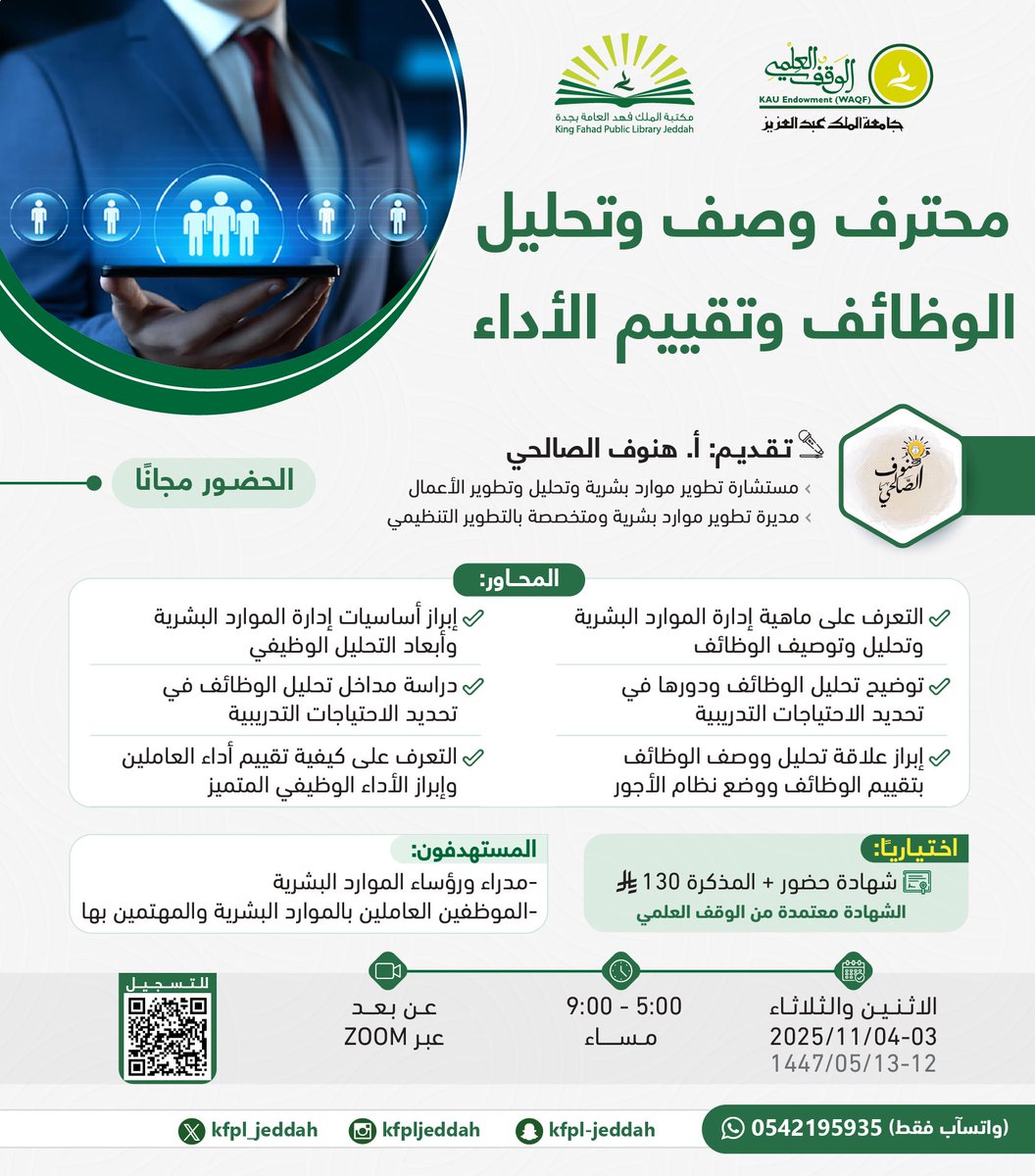 مكتبة الملك فهد العامة بجدة بالتعاون مع الوقف العلمي بجامعة الملك عبدالعزيز تعلن عن إقامة 9 دورات تدريبية (عن بُعد) في مجالات إدارية وتقنية متنوعة، وسيكون حضور الدورات مجاناً مع إمكانية الحصول على شهادة حضور برسوم اختيارية، وذلك حسب التفاصيل الموضحة أدناه:-